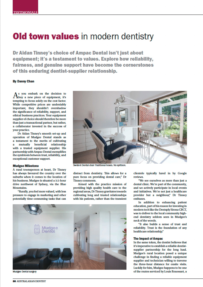 Dr Aidan Tinney’s smooth set-up and operation of Mudgee Dental stands as a testament to the merits of cultivating a mutually beneficial relationship with a trusted equipment supplier. His partnership with Ampac Dental exemplifies the symbiosis between trust, reliability, and exceptional customer support.